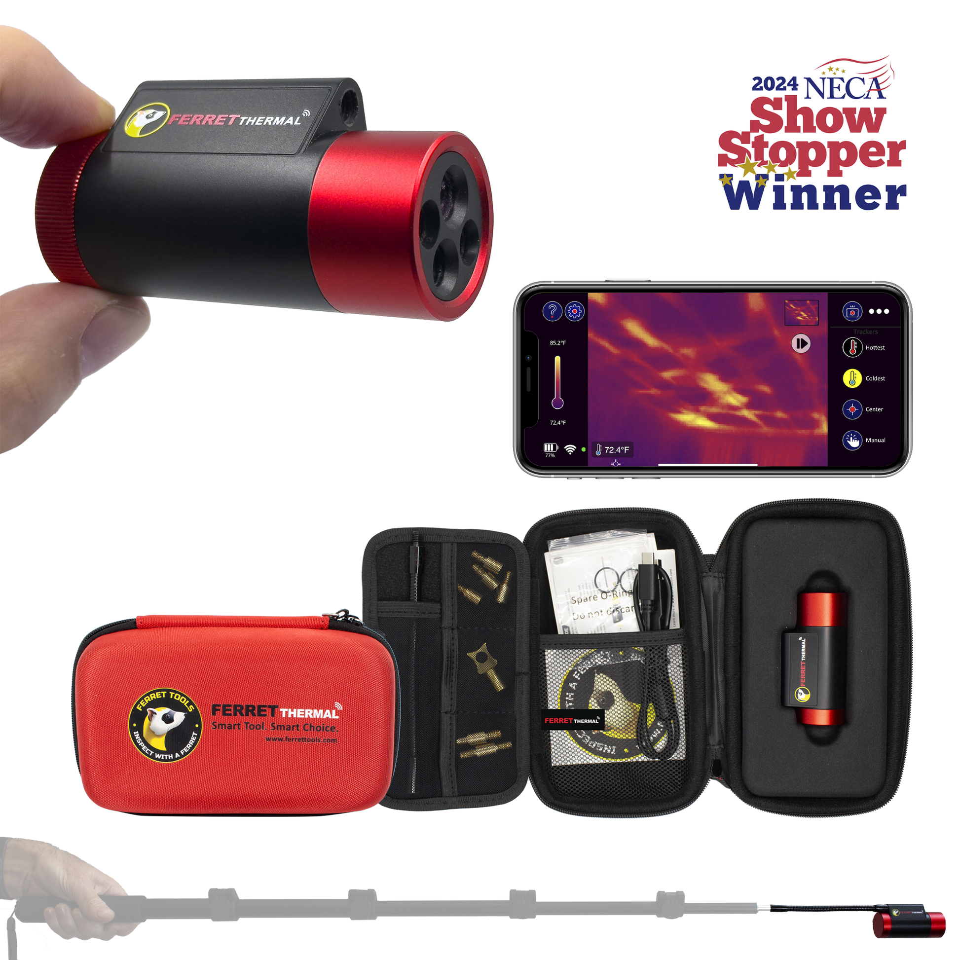 The new Ferret Thermal wireless imaging camera gives you extended reach for thermal vision that is not limited by handheld and can be attached to a Ferret Stick or glow rod to see more and do more. Identify problems quickly and easily. Ferret Tools offers the latest innovation in inspection camera solutions.