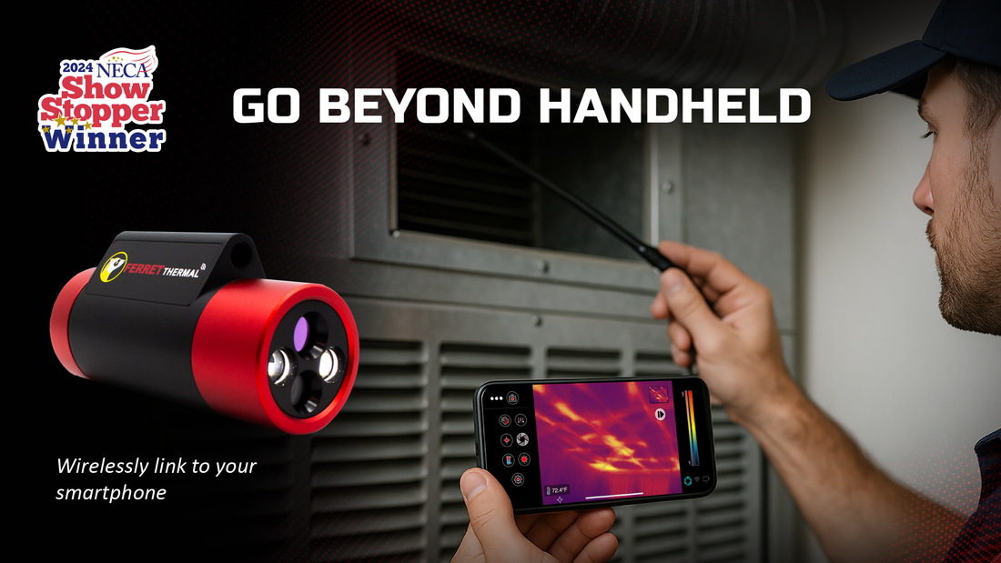 The new Ferret Thermal wireless inspection camera gives you extended reach for thermal vision that is not limited by handheld and can be attached to a Ferret Stick or glow rod to see more and do more. Identify problems quickly and easily.